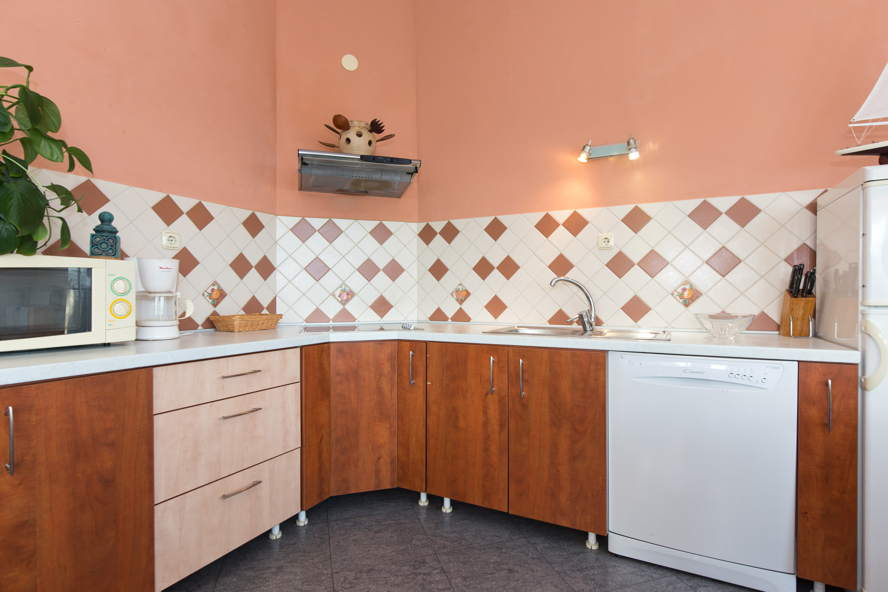 The kitchen is fully equipped with 4 ceramic hobs, an oven, a microwave, a dishwasher, a refrigerator/freezer, a coffee maker, a kettle, and a toaster. The apartment has air conditioning and oil central heating.